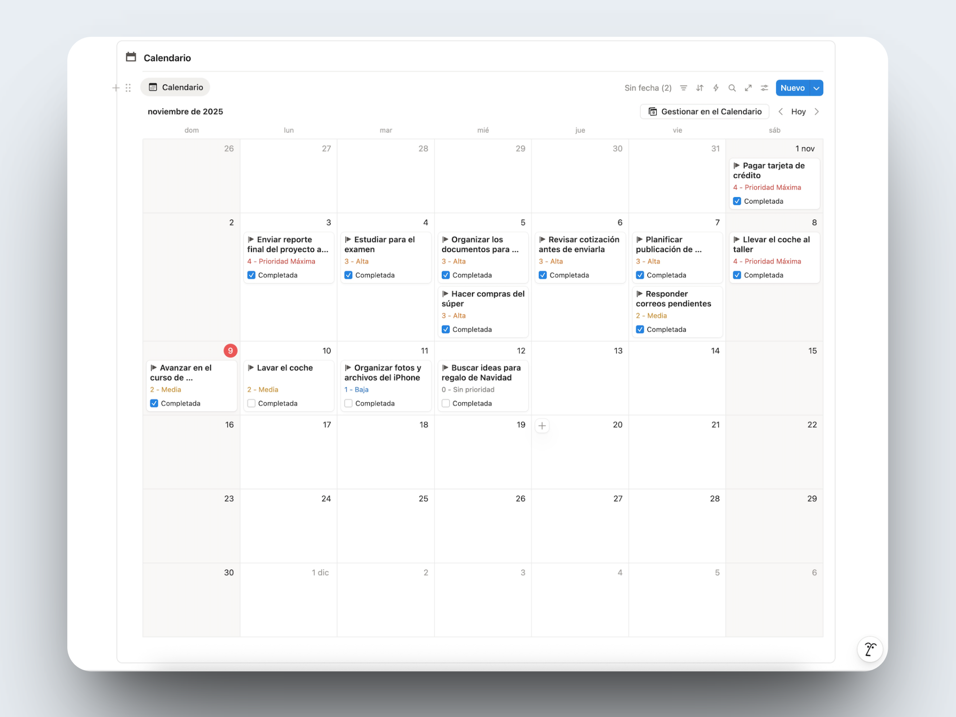 Visualiza tus actividades relevantes, distribuye tu tiempo con intención y mantén una perspectiva general de tus objetivos.