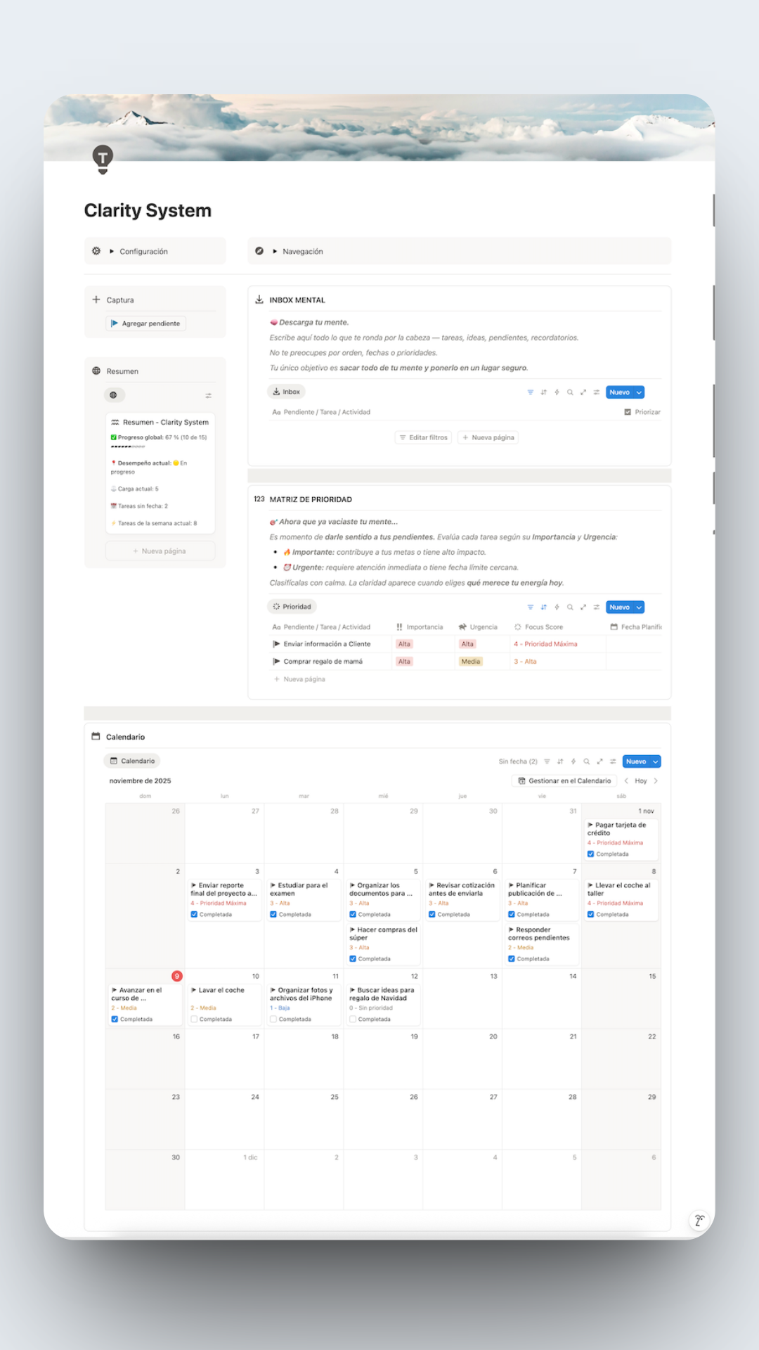 El Clarity System es una plantilla en Notion diseñada para ayudarte a organizar tus ideas, priorizar tus tareas y mantener claridad mental. Su estructura está pensada para que tomes decisiones con enfoque y dejes atrás la sensación de caos y sobrecarga.